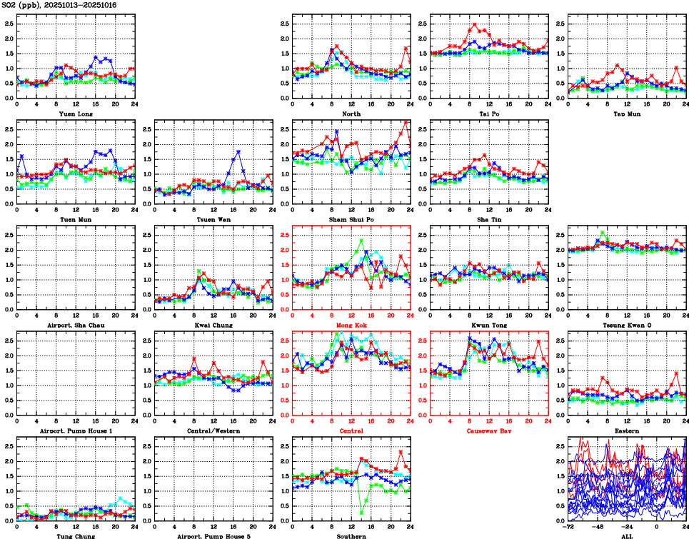 | Air Quality Data Time Series for SO2 (2025/10/16) | ( Line colors: Day -3 Day -2 Day -1 Current day ) | 2D Map Current AQHI |