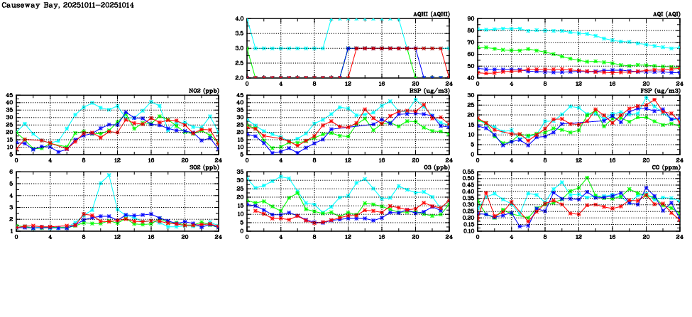 | Air Quality Data Time Series in Causeway Bay (2025/10/14) | ( Line colors: Day -3 Day -2 Day -1 Current day ) | 2D Map Current AQHI |