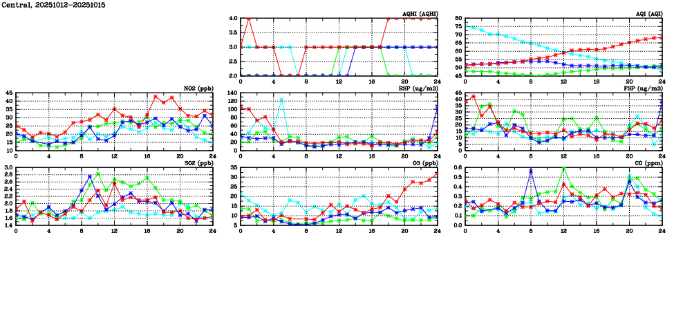 | Air Quality Data Time Series in Central (2025/10/15) | ( Line colors: Day -3 Day -2 Day -1 Current day ) | 2D Map Current AQHI |