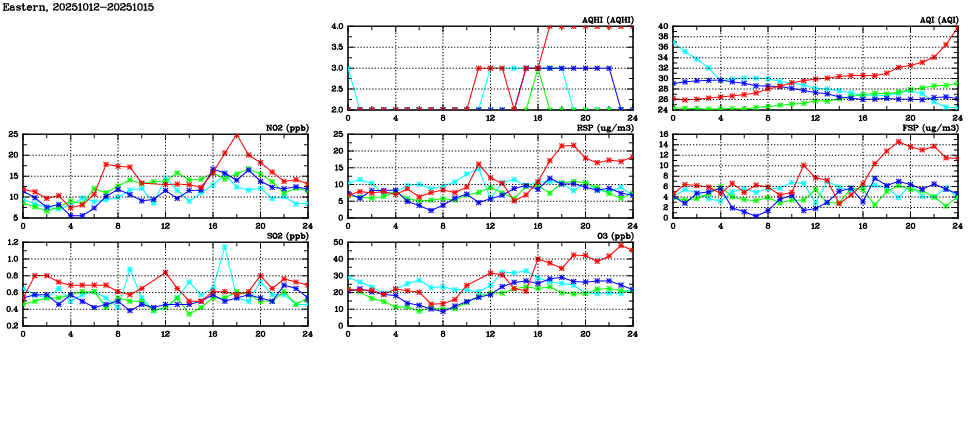 | Air Quality Data Time Series in Eastern (2025/10/15) | ( Line colors: Day -3 Day -2 Day -1 Current day ) | 2D Map Current AQHI |