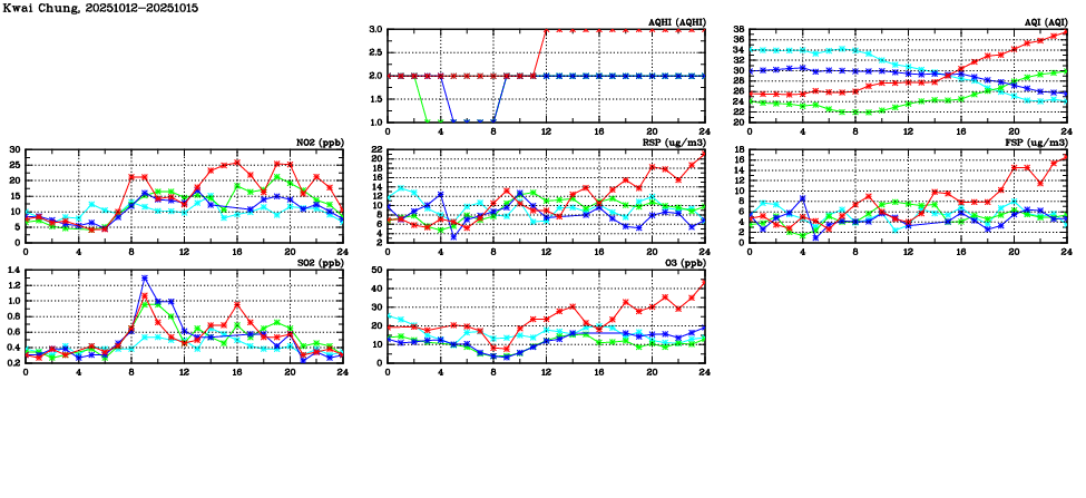 | Air Quality Data Time Series in Kwai Chung (2025/10/15) | ( Line colors: Day -3 Day -2 Day -1 Current day ) | 2D Map Current AQHI |