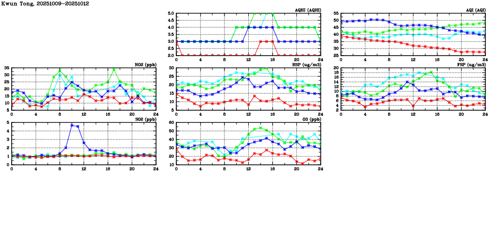 | Air Quality Data Time Series in Kwun Tong (2025/10/12) | ( Line colors: Day -3 Day -2 Day -1 Current day ) | 2D Map Current AQHI |