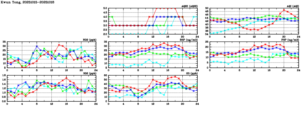 | Air Quality Data Time Series in Kwun Tong (2025/10/18) | ( Line colors: Day -3 Day -2 Day -1 Current day ) | 2D Map Current AQHI |