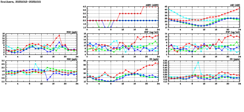 | Air Quality Data Time Series in Southern (2025/10/15) | ( Line colors: Day -3 Day -2 Day -1 Current day ) | 2D Map Current AQHI |