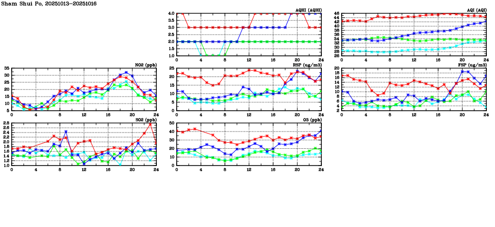 | Air Quality Data Time Series in Sham Shui Po (2025/10/16) | ( Line colors: Day -3 Day -2 Day -1 Current day ) | 2D Map Current AQHI |