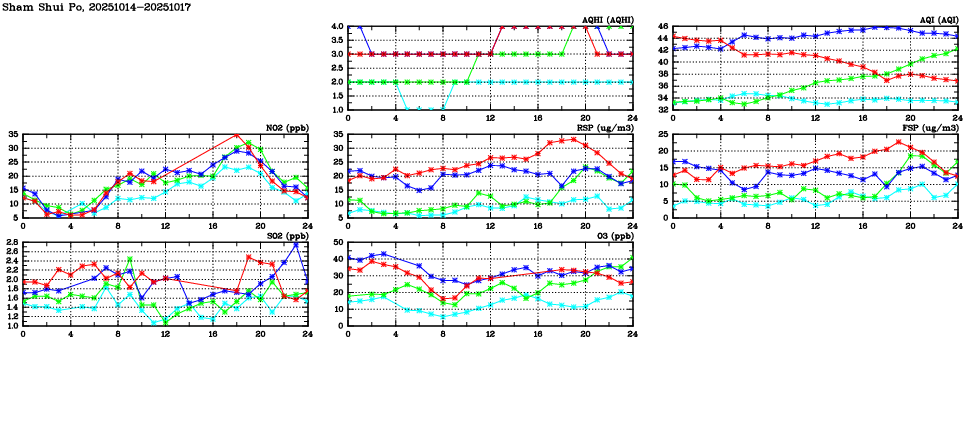 | Air Quality Data Time Series in Sham Shui Po (2025/10/17) | ( Line colors: Day -3 Day -2 Day -1 Current day ) | 2D Map Current AQHI |