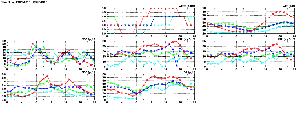 | Air Quality Data Time Series in Sha Tin (2025/10/18) | ( Line colors: Day -3 Day -2 Day -1 Current day ) | 2D Map Current AQHI |