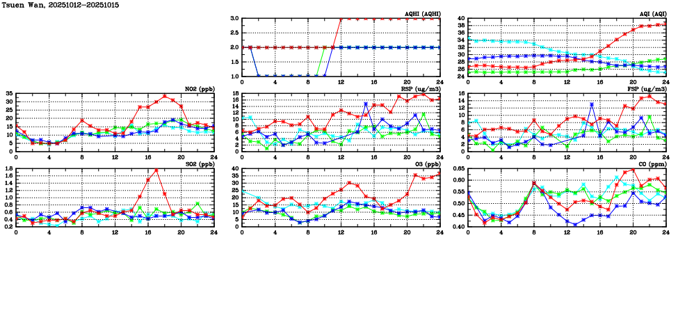 | Air Quality Data Time Series in Tsuen Wan (2025/10/15) | ( Line colors: Day -3 Day -2 Day -1 Current day ) | 2D Map Current AQHI |