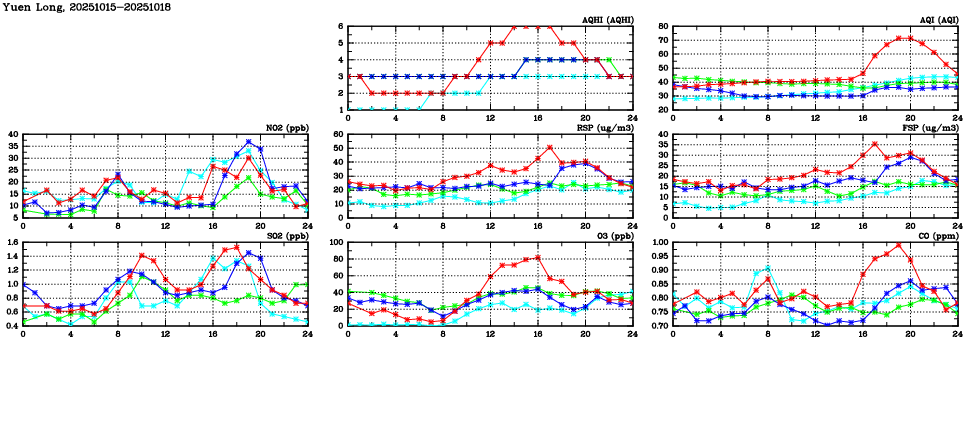 | Air Quality Data Time Series in Yuen Long (2025/10/18) | ( Line colors: Day -3 Day -2 Day -1 Current day ) | 2D Map Current AQHI |