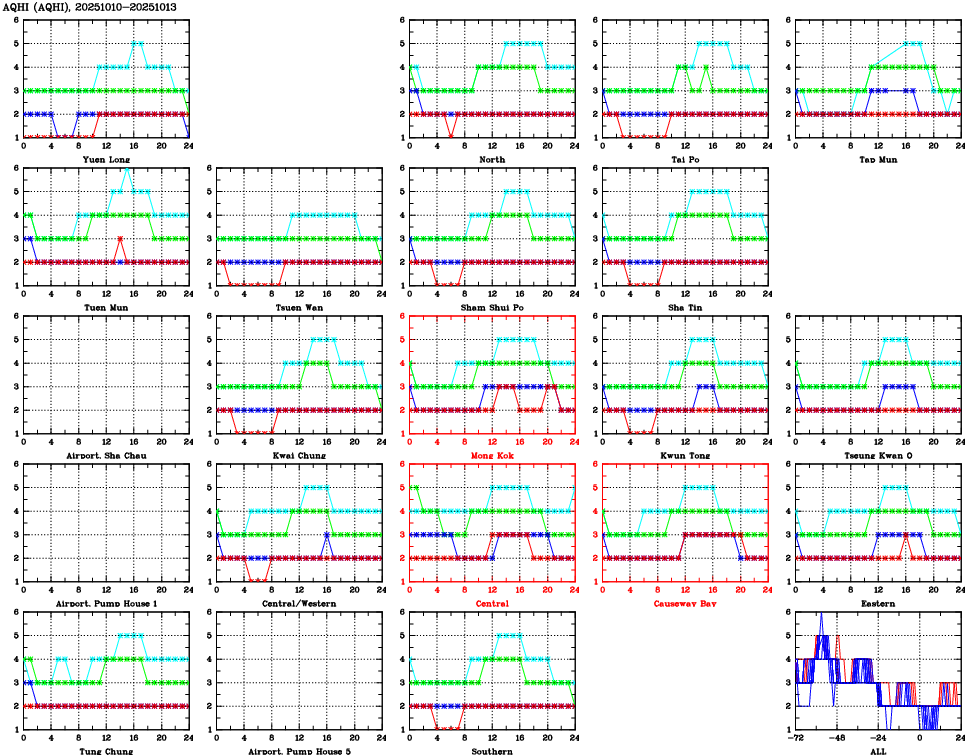 | Air Quality Data Time Series for AQHI (2025/10/13) | ( Line colors: Day -3 Day -2 Day -1 Current day ) | 2D Map Current AQHI |