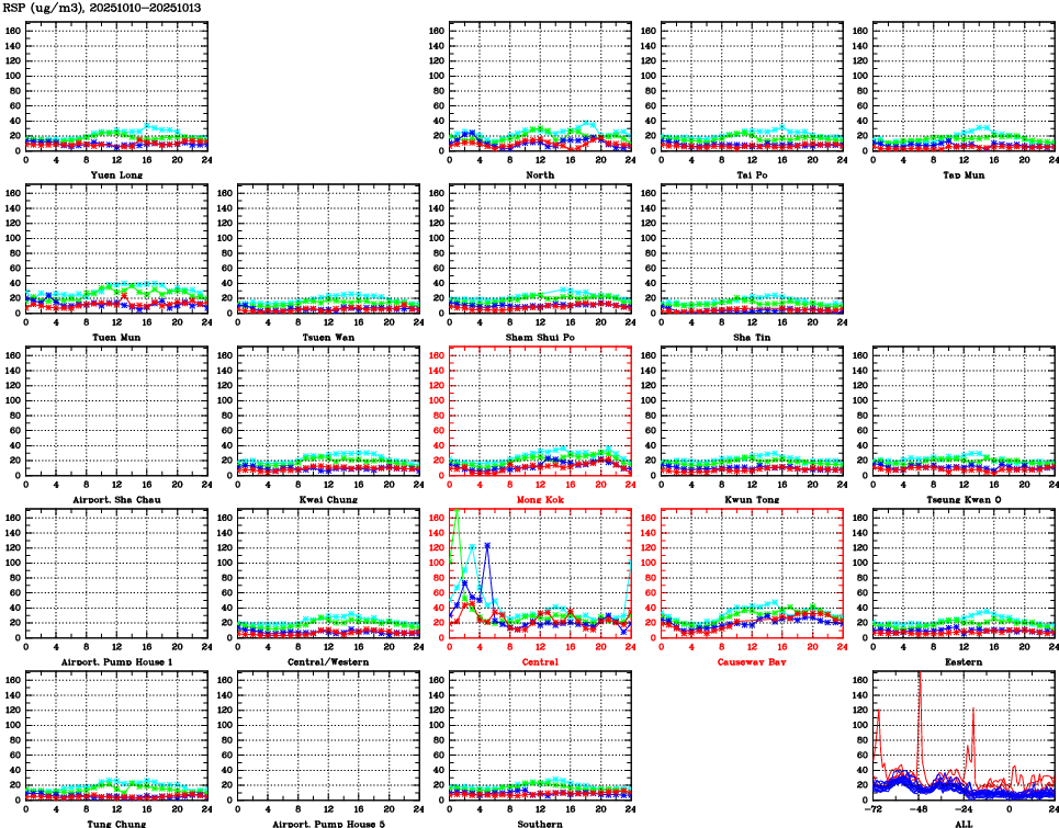 | Air Quality Data Time Series for RSP (2025/10/13) | ( Line colors: Day -3 Day -2 Day -1 Current day ) | 2D Map Current AQHI |