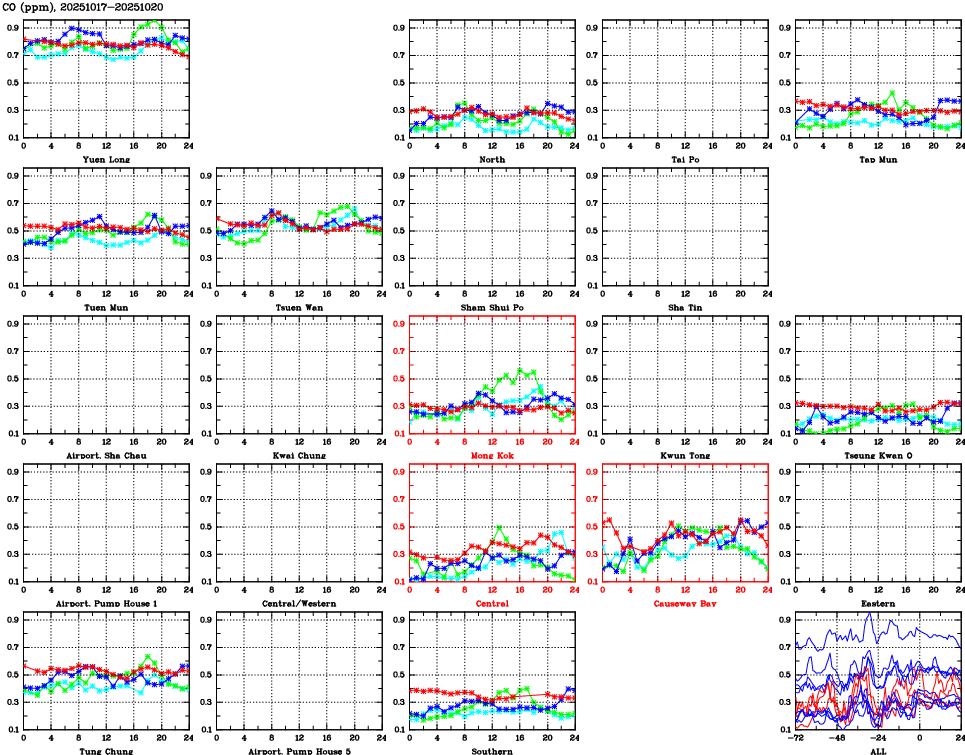 | Air Quality Data Time Series for CO (2025/10/20) | ( Line colors: Day -3 Day -2 Day -1 Current day ) | 2D Map Current AQHI |
