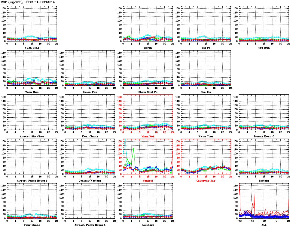 | Air Quality Data Time Series for RSP (2025/10/14) | ( Line colors: Day -3 Day -2 Day -1 Current day ) | 2D Map Current AQHI |