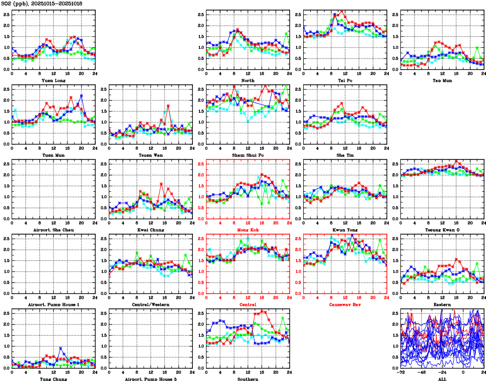 | Air Quality Data Time Series for SO2 (2025/10/18) | ( Line colors: Day -3 Day -2 Day -1 Current day ) | 2D Map Current AQHI |