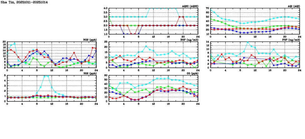 | Air Quality Data Time Series in Sha Tin (2025/10/14) | ( Line colors: Day -3 Day -2 Day -1 Current day ) | 2D Map Current AQHI |
