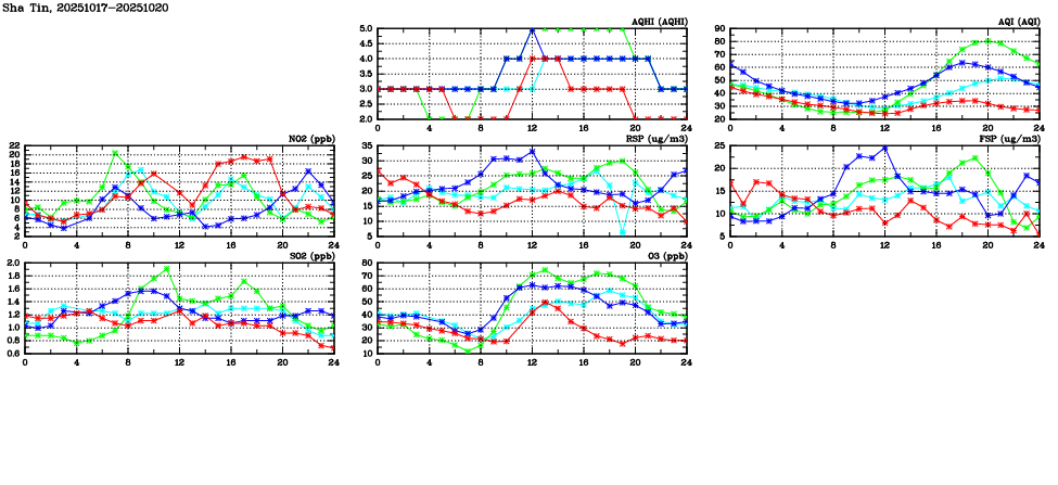 | Air Quality Data Time Series in Sha Tin (2025/10/20) | ( Line colors: Day -3 Day -2 Day -1 Current day ) | 2D Map Current AQHI |