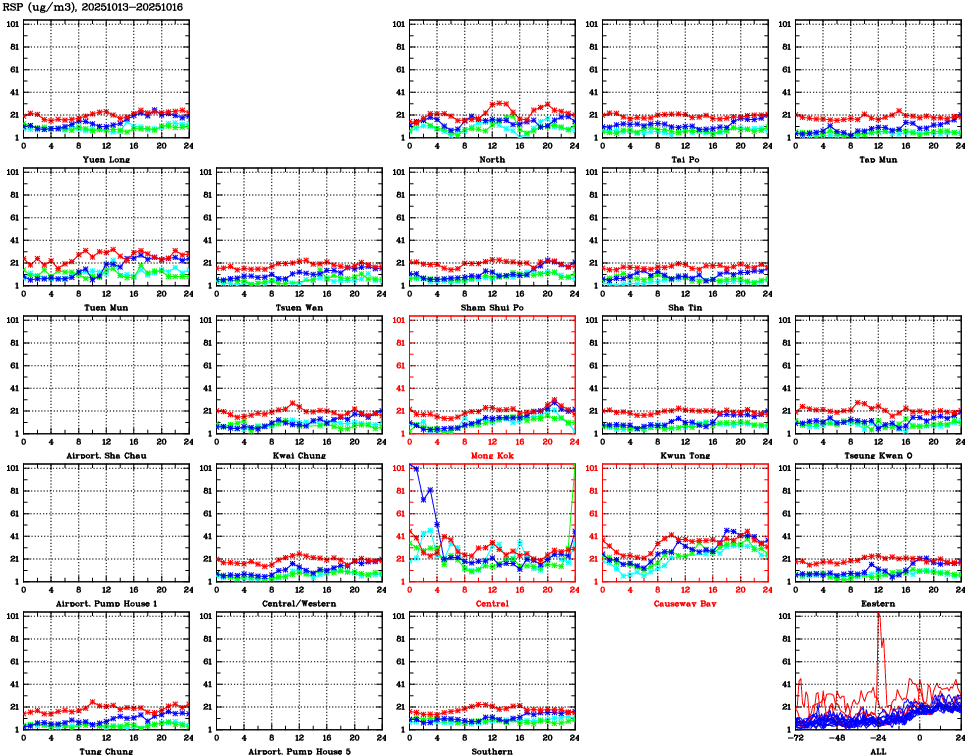 | Air Quality Data Time Series for RSP (2025/10/16) | ( Line colors: Day -3 Day -2 Day -1 Current day ) | 2D Map Current AQHI |