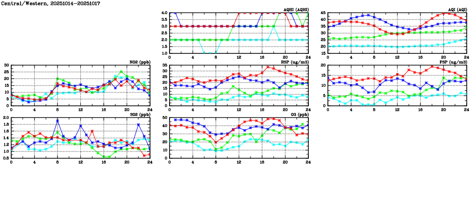 | Air Quality Data Time Series in Central/Western (2025/10/17) | ( Line colors: Day -3 Day -2 Day -1 Current day ) | 2D Map Current AQHI |