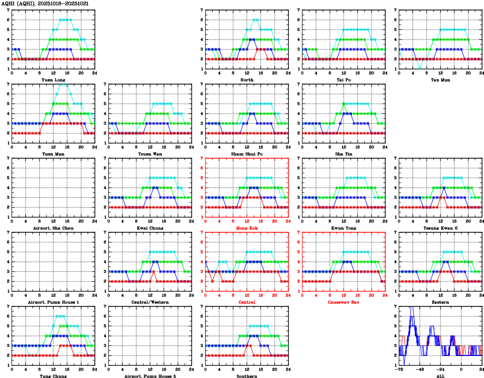 | Air Quality Data Time Series for AQHI (2025/10/21) | ( Line colors: Day -3 Day -2 Day -1 Current day ) | 2D Map Current AQHI |