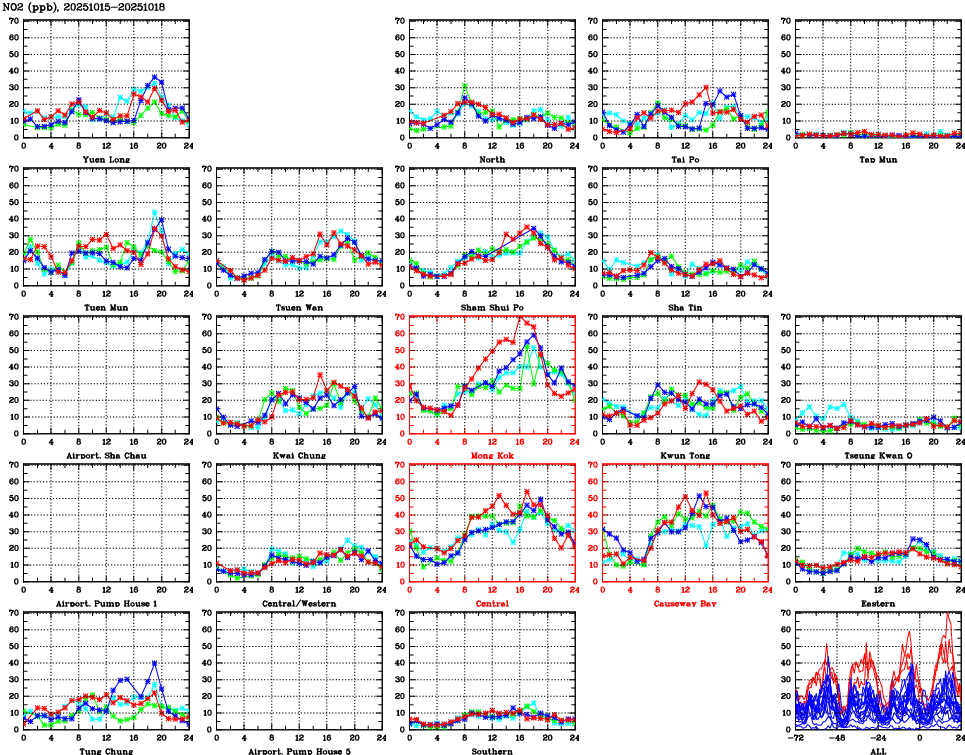 | Air Quality Data Time Series for NO2 (2025/10/18) | ( Line colors: Day -3 Day -2 Day -1 Current day ) | 2D Map Current AQHI |