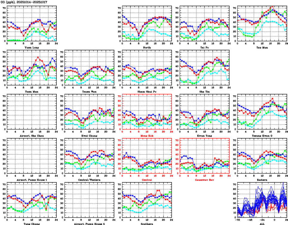 | Air Quality Data Time Series for O3 (2025/10/17) | ( Line colors: Day -3 Day -2 Day -1 Current day ) | 2D Map Current AQHI |