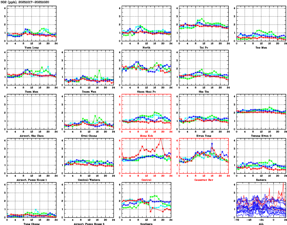 | Air Quality Data Time Series for SO2 (2025/10/20) | ( Line colors: Day -3 Day -2 Day -1 Current day ) | 2D Map Current AQHI |