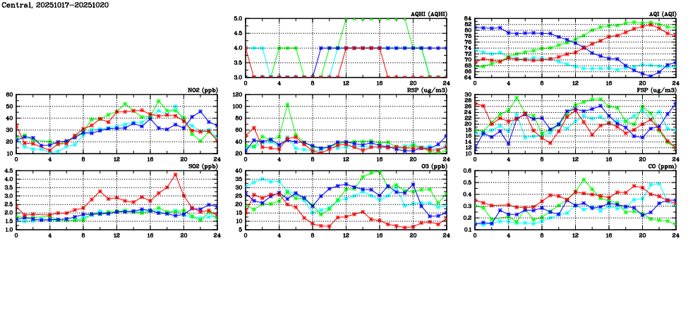 | Air Quality Data Time Series in Central (2025/10/20) | ( Line colors: Day -3 Day -2 Day -1 Current day ) | 2D Map Current AQHI |