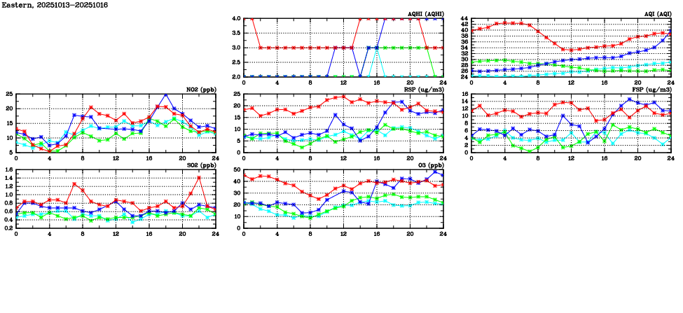 | Air Quality Data Time Series in Eastern (2025/10/16) | ( Line colors: Day -3 Day -2 Day -1 Current day ) | 2D Map Current AQHI |