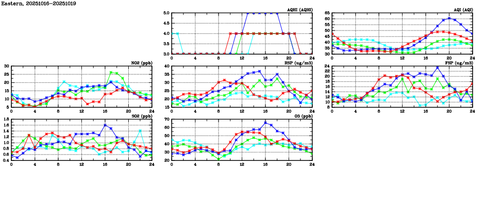 | Air Quality Data Time Series in Eastern (2025/10/19) | ( Line colors: Day -3 Day -2 Day -1 Current day ) | 2D Map Current AQHI |