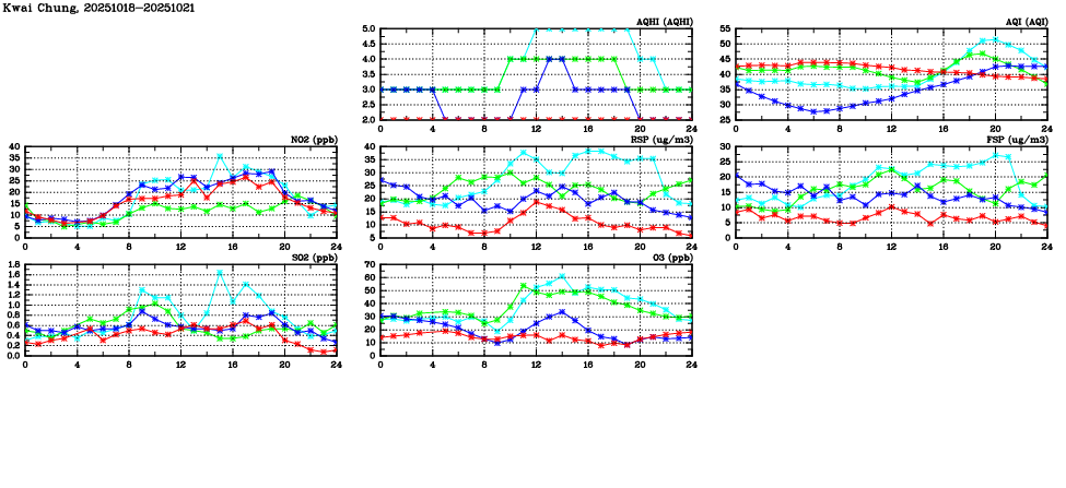 | Air Quality Data Time Series in Kwai Chung (2025/10/21) | ( Line colors: Day -3 Day -2 Day -1 Current day ) | 2D Map Current AQHI |