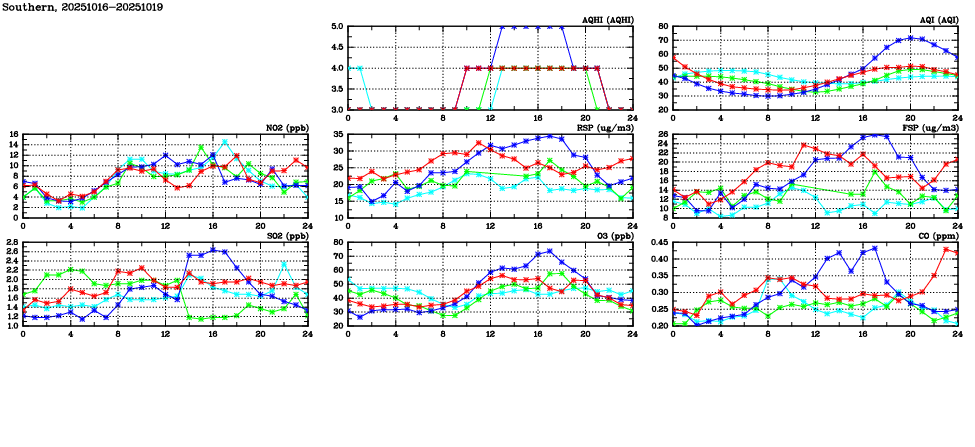 | Air Quality Data Time Series in Southern (2025/10/19) | ( Line colors: Day -3 Day -2 Day -1 Current day ) | 2D Map Current AQHI |