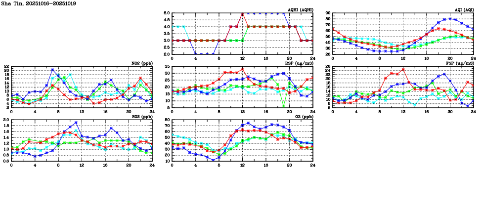 | Air Quality Data Time Series in Sha Tin (2025/10/19) | ( Line colors: Day -3 Day -2 Day -1 Current day ) | 2D Map Current AQHI |