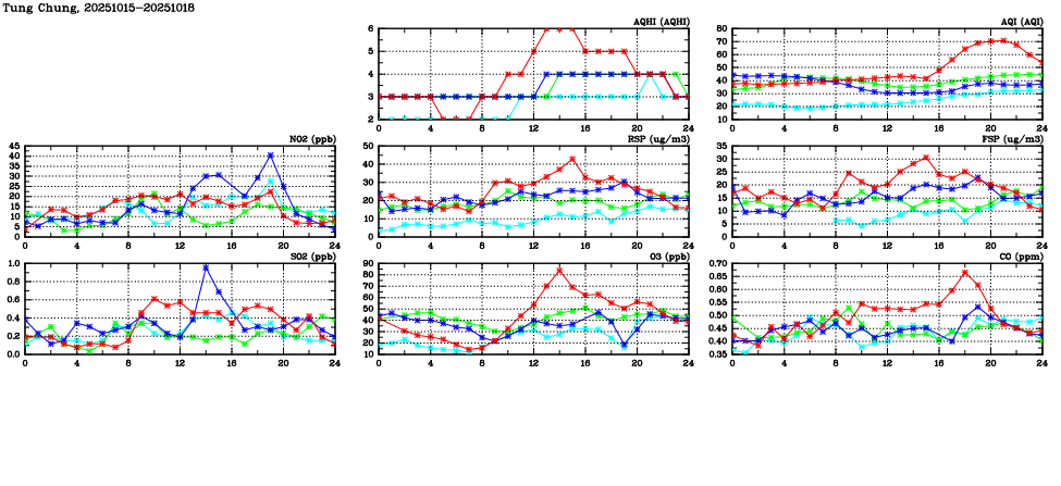 | Air Quality Data Time Series in Tung Chung (2025/10/18) | ( Line colors: Day -3 Day -2 Day -1 Current day ) | 2D Map Current AQHI |