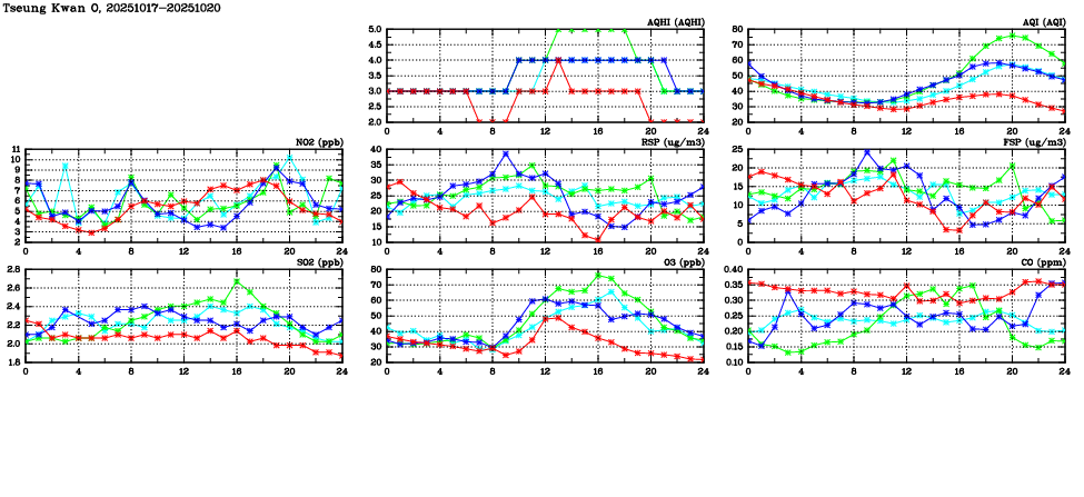 | Air Quality Data Time Series in Tseung Kwan O (2025/10/20) | ( Line colors: Day -3 Day -2 Day -1 Current day ) | 2D Map Current AQHI |