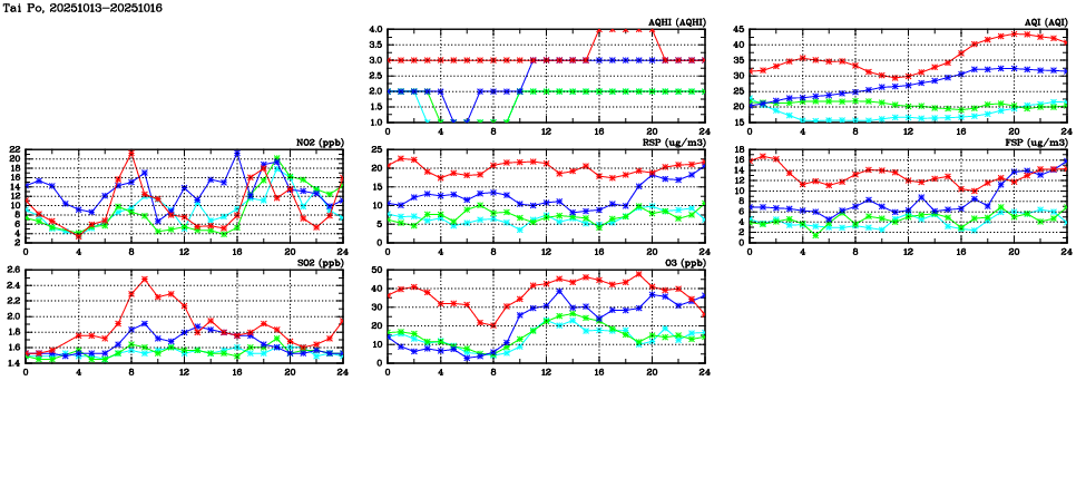 | Air Quality Data Time Series in Tai Po (2025/10/16) | ( Line colors: Day -3 Day -2 Day -1 Current day ) | 2D Map Current AQHI |