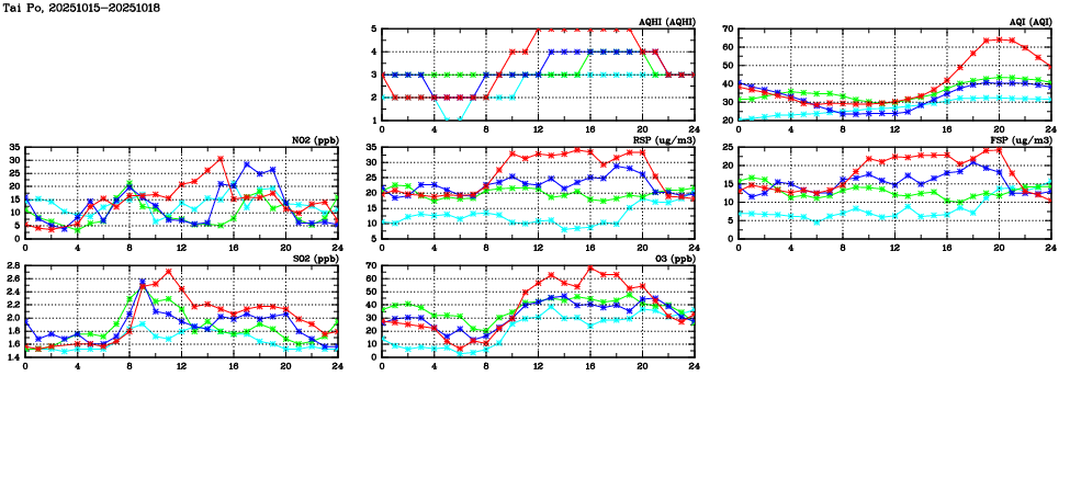 | Air Quality Data Time Series in Tai Po (2025/10/18) | ( Line colors: Day -3 Day -2 Day -1 Current day ) | 2D Map Current AQHI |