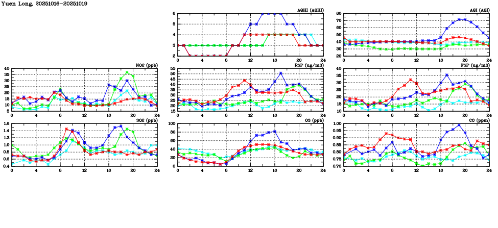 | Air Quality Data Time Series in Yuen Long (2025/10/19) | ( Line colors: Day -3 Day -2 Day -1 Current day ) | 2D Map Current AQHI |