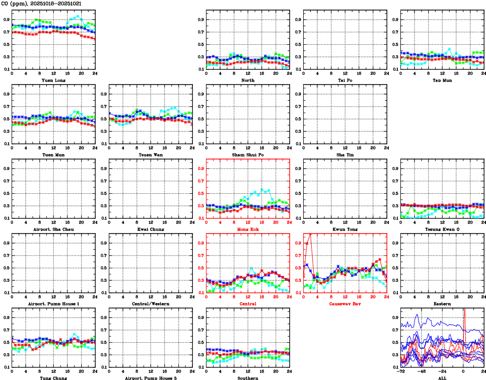 | Air Quality Data Time Series for CO (2025/10/21) | ( Line colors: Day -3 Day -2 Day -1 Current day ) | 2D Map Current AQHI |