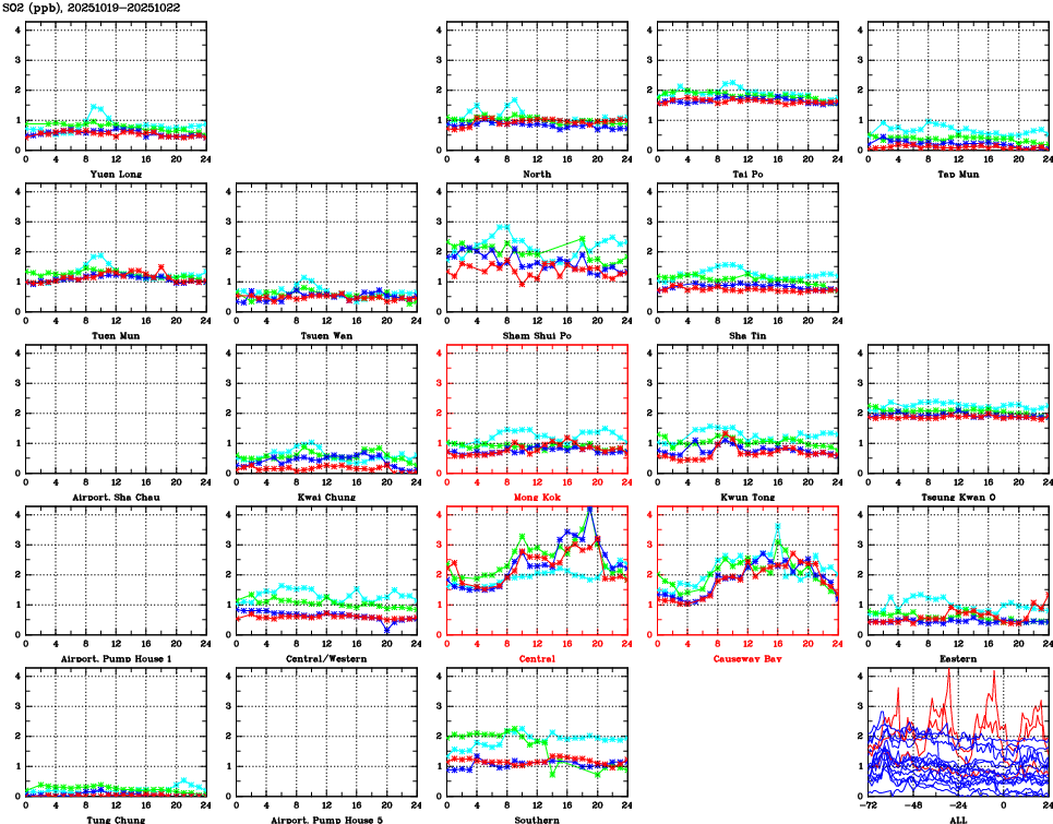 | Air Quality Data Time Series for SO2 (2025/10/22) | ( Line colors: Day -3 Day -2 Day -1 Current day ) | 2D Map Current AQHI |