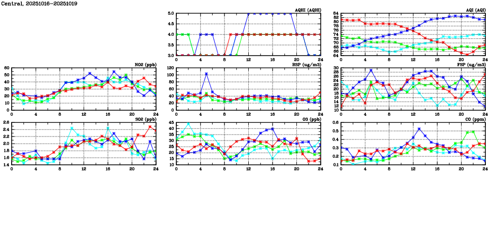| Air Quality Data Time Series in Central (2025/10/19) | ( Line colors: Day -3 Day -2 Day -1 Current day ) | 2D Map Current AQHI |
