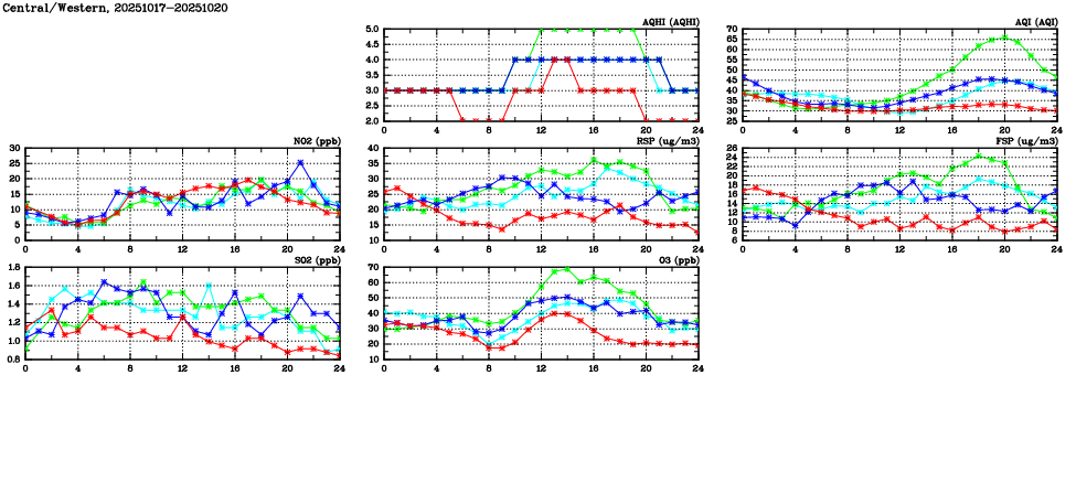 | Air Quality Data Time Series in Central/Western (2025/10/20) | ( Line colors: Day -3 Day -2 Day -1 Current day ) | 2D Map Current AQHI |
