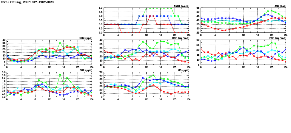 | Air Quality Data Time Series in Kwai Chung (2025/10/20) | ( Line colors: Day -3 Day -2 Day -1 Current day ) | 2D Map Current AQHI |