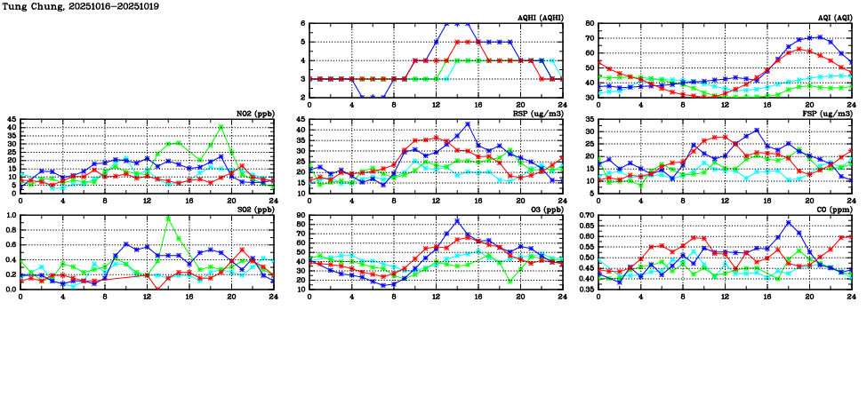 | Air Quality Data Time Series in Tung Chung (2025/10/19) | ( Line colors: Day -3 Day -2 Day -1 Current day ) | 2D Map Current AQHI |