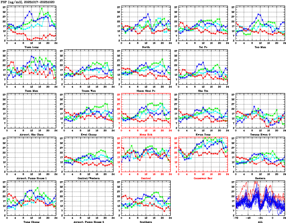 | Air Quality Data Time Series for FSP (2025/10/20) | ( Line colors: Day -3 Day -2 Day -1 Current day ) | 2D Map Current AQHI |
