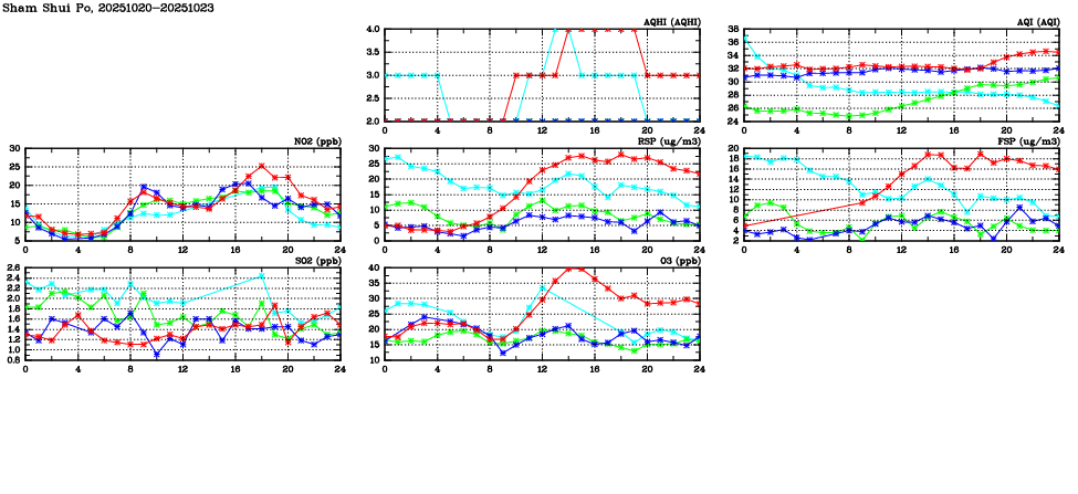 | Air Quality Data Time Series in Sham Shui Po (2025/10/23) | ( Line colors: Day -3 Day -2 Day -1 Current day ) | 2D Map Current AQHI |