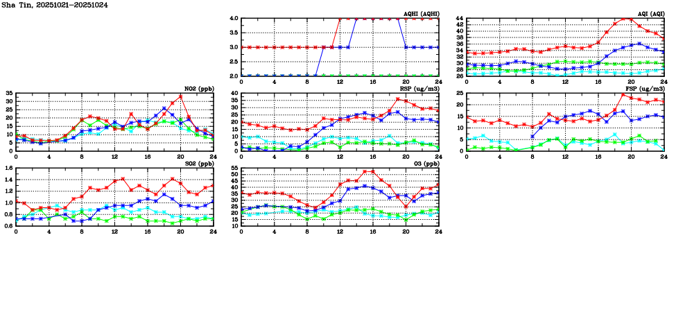 | Air Quality Data Time Series in Sha Tin (2025/10/24) | ( Line colors: Day -3 Day -2 Day -1 Current day ) | 2D Map Current AQHI |