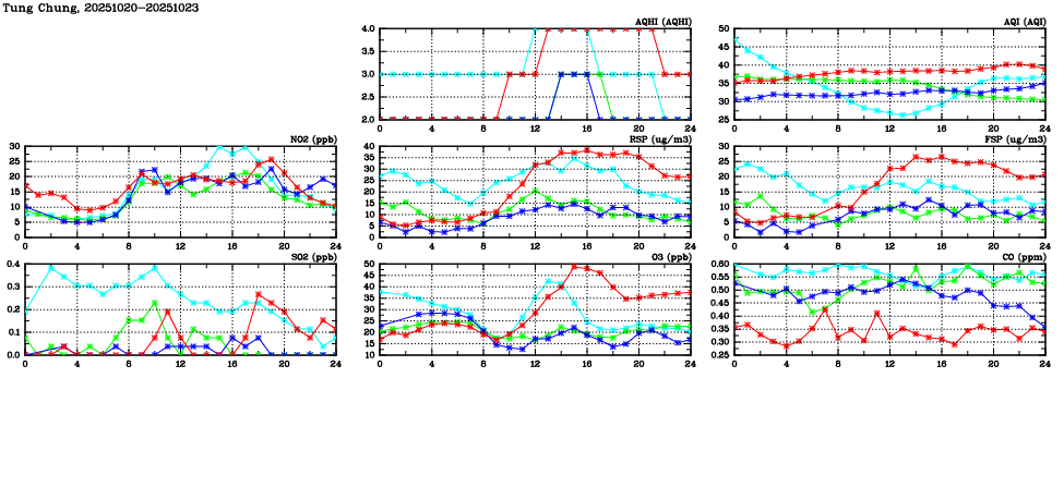 | Air Quality Data Time Series in Tung Chung (2025/10/23) | ( Line colors: Day -3 Day -2 Day -1 Current day ) | 2D Map Current AQHI |