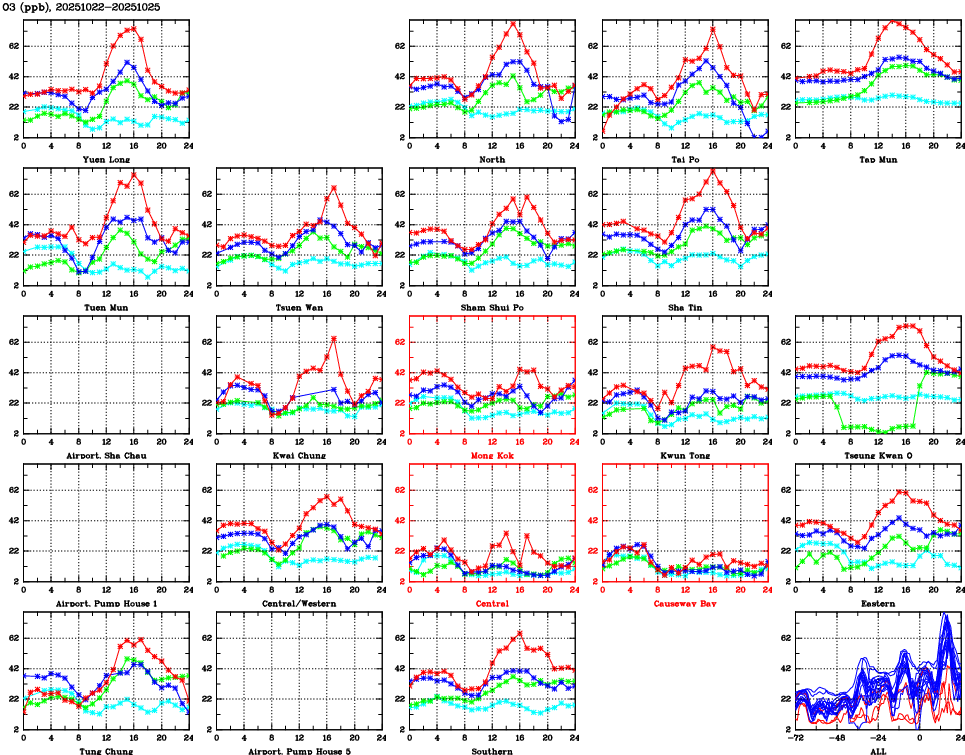 | Air Quality Data Time Series for O3 (2025/10/25) | ( Line colors: Day -3 Day -2 Day -1 Current day ) | 2D Map Current AQHI |