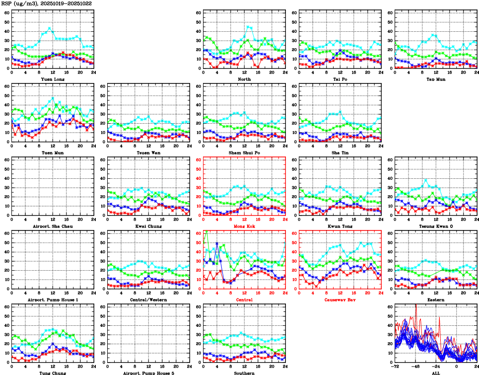 | Air Quality Data Time Series for RSP (2025/10/22) | ( Line colors: Day -3 Day -2 Day -1 Current day ) | 2D Map Current AQHI |