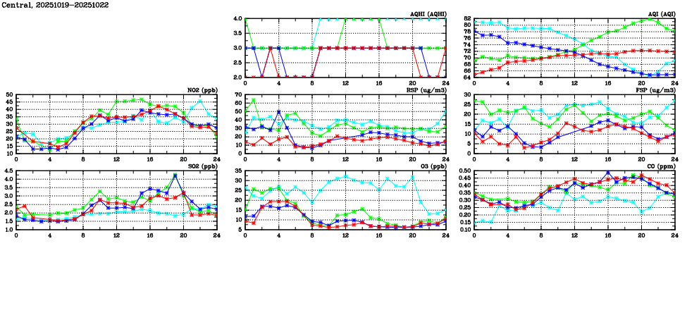 | Air Quality Data Time Series in Central (2025/10/22) | ( Line colors: Day -3 Day -2 Day -1 Current day ) | 2D Map Current AQHI |